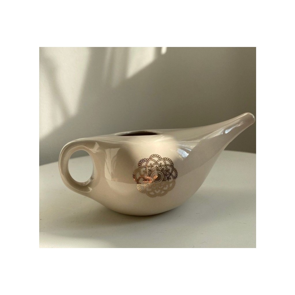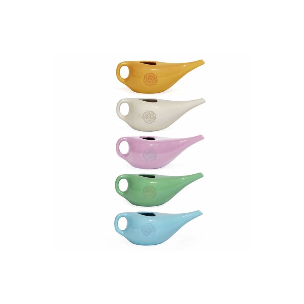 A jala neti gyakorlása során, amelyet néha orrzuhanynak is neveznek, az orrnyálkahártyát megnedvesítik, és az orrmelléküregeket megtisztítják. A sóoldat tisztítja az orrüregeket és támogatja az immunrendszert. A Neti kannák mázas kerámiából készülnek, és mandalával díszítik.