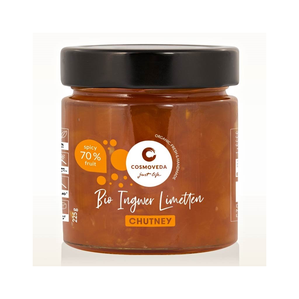 A Cosmoveda Organic chutney napon érett gyömbérből és lime-ból készült. A frissen szedett gyümölcsöket válogatott fűszerekkel kombinálják, és az eredmény egy édes-savanyú köret, amely mártogatósként vagy szószként is használható.
