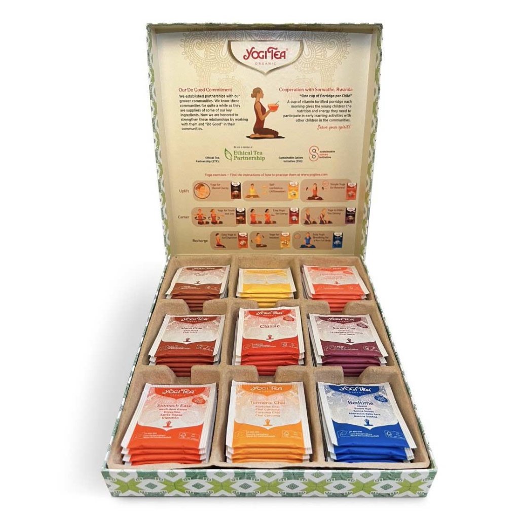 A Yogi Tea Selection Box egy ajándékdoboz, amely a 9 legnépszerűbb Yogi Tea klasszikust tartalmazza. Minden teát hagyományos ájurvédikus receptek alapján alkottak meg, a fűszerek és gyógynövények harmonikus kombinációja pedig gazdag ízvilágot és jótékony hatásokat kínál. Tökéletes ajándéknak vagy kóstolókészletnek a nyugalom és jólét pillanataihoz.